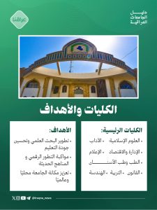 🎓 الكليات الرئيسية: العلوم الإسلامية، الآداب، الإدارة والاقتصاد، الإعلام، التربية، الطب وطب الأسنان، القانون، الهندسة