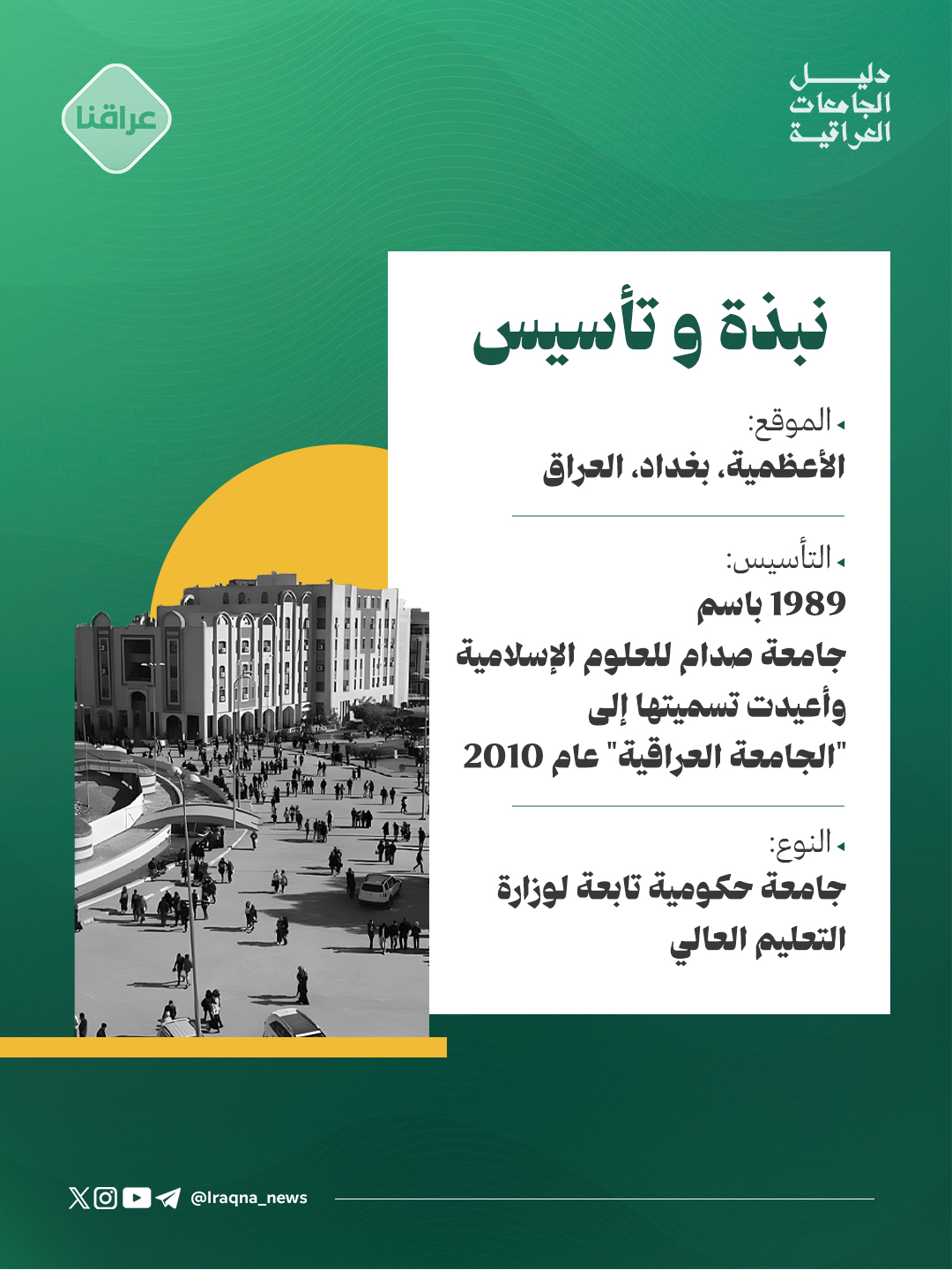 🗓 التأسيس: 1989 باسم “جامعة صدام للعلوم الإسلامية”، وأعيدت تسميتها إلى “الجامعة العراقية” عام 2010