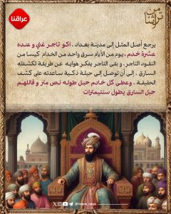 يرجع أصل المثل إلى مدينة بغـداد ، اكو تاجـر غني و عنده عشرة خدم ، يوم من الأيام سرق واحد من الخدام كيسا من النقـود التاجر، و بقى التاجر يفكـر هوايه عن طريقة تكشفله السارق ، إلى أن توصل إلى حيلة ذكـية ساعدته على كشف الحقيقـة ،