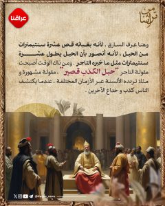 وهنا عرف السارق ، لأنه بغـبائه قص عشرة سنتيمترات من الحبل ، لأنه أتصور بأن الحبل يطول عشرة سنتيمترات مثل ما خبره التاجر ، ومن ذاك الوقت أصبحت مقولة التاجر “حبل الكذب قصير” ، مقولة مشهورة و مثلا تردده الألسنة عبر الأزمان المختلفة ، عندما يكتشف الناس كذب و خداع الآخرين