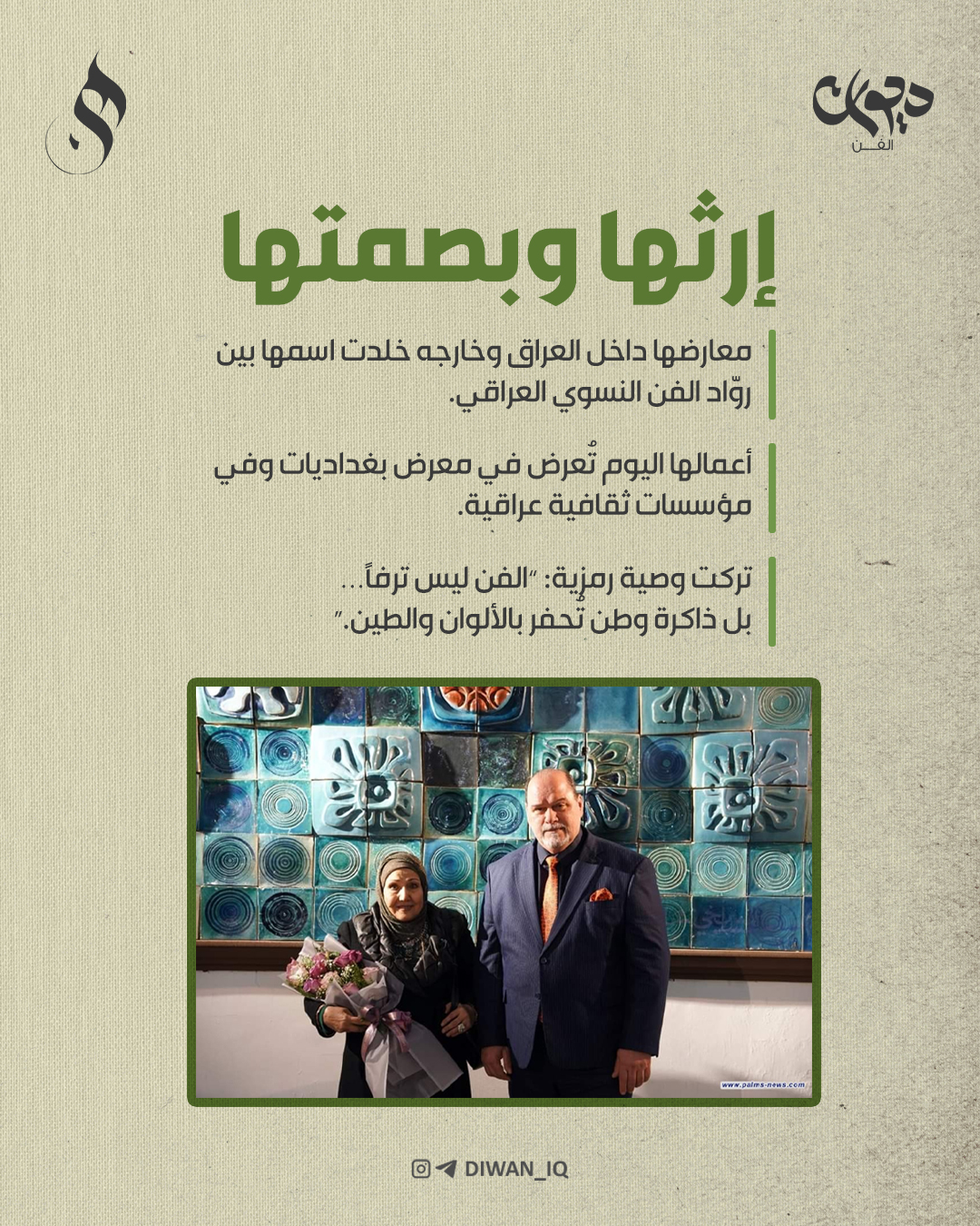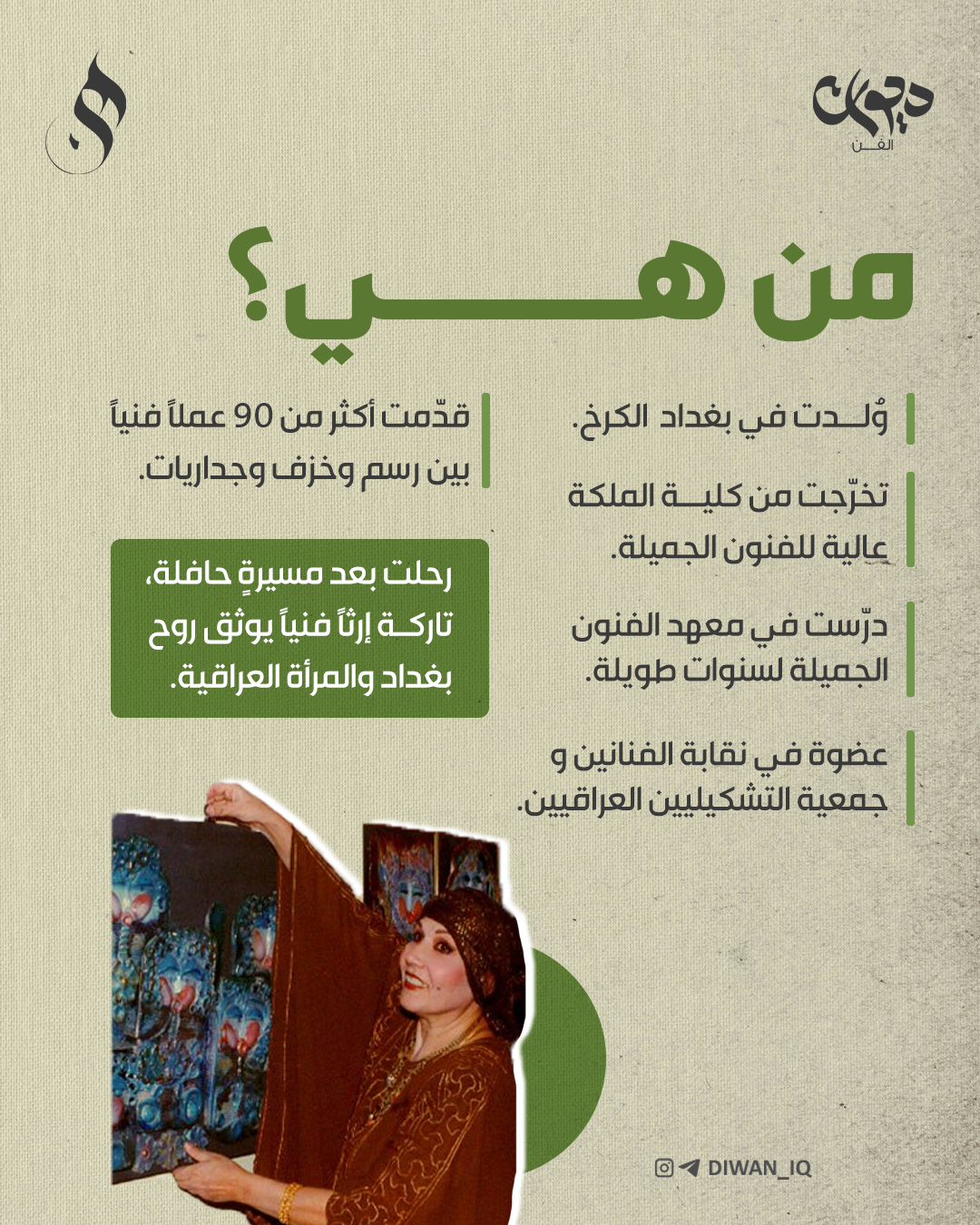 📍 رحلت بعد مسيرةٍ حافلة، تاركة إرثاً فنياً يوثق روح بغداد والمرأة العراقية.